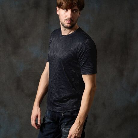 ナイロンをベースにポリウレタン糸でストレッチ性を強化した中肉素材のブリスタージャカード。膨れ編みで表現したバスケット柄風の独特な表面感とソリッドな陰影感が特徴です。合繊の為、軽くて柔らかくスポ−ツウェアの様な快適な着用感。速乾性と防シワ性にも優れています。