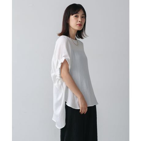 袖の折り返し涙あきのバックデザインがシンプルながら女性らしさを演出。着丈も後ろを長めにしているのでしっかりお尻が隠れる仕様も嬉しいポイント。暑さが厳しさを増す中、さらりと快適にご着用いただけます。