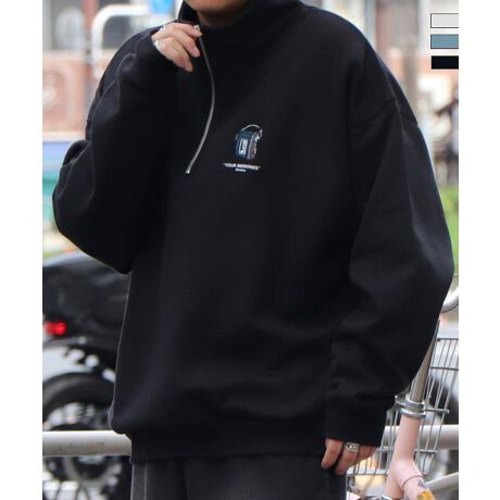 ILL'S イラストワンポイント 刺繍 ビッグシルエット 裏起毛ハーフジッププルオーバー