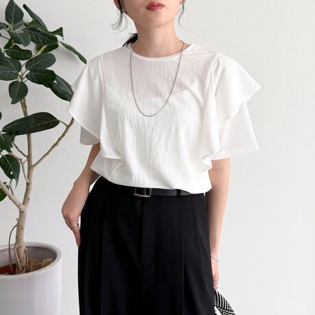 ・布帛のようなカットソー素材を使用した、ラッフルショルダーデザインの半袖プルオーバーです