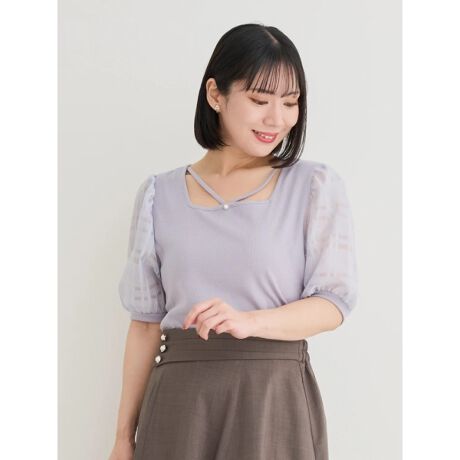 袖シアーチェックトップス