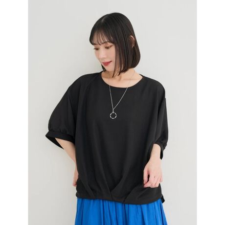 アクセサリー付き異素材切り替え裾タックプルオーバー