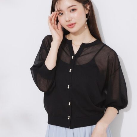 ダブルパール調釦がアクセントになった、5分袖シアーニットのトップスカーディ