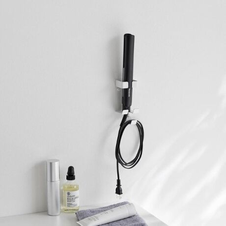 洗面所の壁面に石こうボードピンで簡単に取り付けできるヘアーアイロンホルダー。