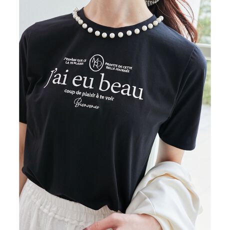 襟周りのパールビーズと刺繍ロゴがポイントになった上品Tシャツ。