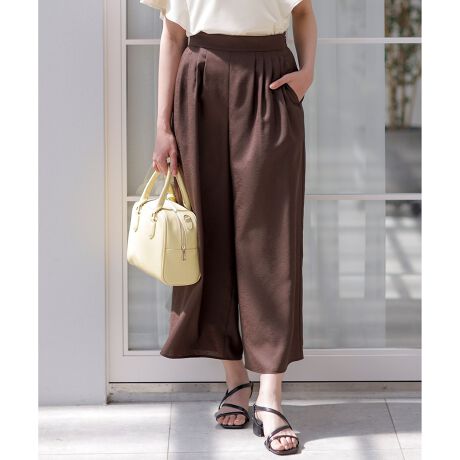 ・たっぷりとした分量感のタックフレアパンツ・体型をカバーし、穿くだけでサマ見えする一着・細かく入ったタックデザインが程よくリラクシーな雰囲気に・軽く柔らかいマット裏地を使用し、透け感をカバーしながら涼やかな印象
