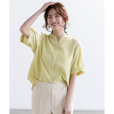・体型やテイストを選ばずコーデに取り入れやすいスリット入りのバンドカラーデザイン・程よくゆとりのあるサイズ感・ボタンを開けて羽織りとしても使える汎用性の高い一着・前見頃裏側ボタンを留めることで、タックインをしている様なニュアンスを出せる2WAYデザイン・ジャケットも羽織りやすいセットインスリーブ