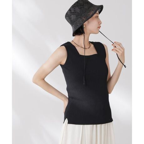 スクエアネックとクルーネックの前後2wayで着回せるタンクトップ。カットソーとは違う上品さをプラスしてくれるサマーニット素材なので、トップスとしてはもちろん、インナーとしても活躍するアイテムです。
