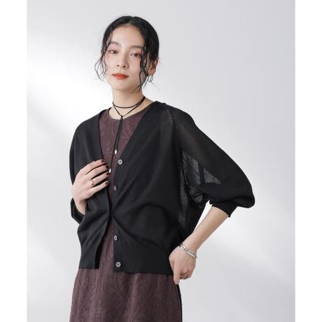 上品な透け感とほんのり潤んだような光沢感のあるシアーカーディガン。外と中の温度差が大きい時期にも重宝し軽量で持ち運びやすく、ちょっとした外出や旅行にも便利です。