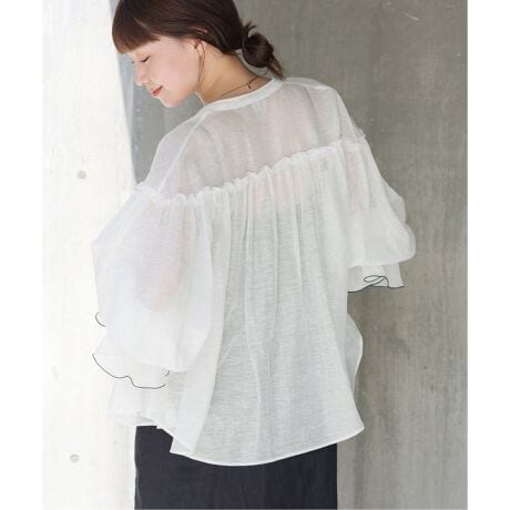 透け感がある長袖のブラウスに、ギャザーをいれて肌離れ良くデザイン。