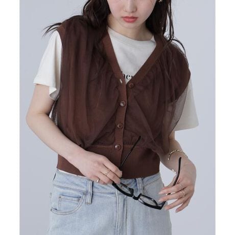 昨年大好評をいただいたニットが新色ブラウンを加えて今年も登場!ニットにチュールを重ねてエアリーな雰囲気に仕上げたニットベスト。前立て部分からギャザーを挟み込み、ふんわりとしたフォルムを演出します。前後2wayで着用できるデザインなので着回し力もバツグン。1枚着としても、Tシャツやキャミワンピースなどに軽く羽織っていただくのもオススメです。 ※モデルの着用画像の場合、光の当たり具合により、実際の色味と異なって見えることがございます。色味は、商品単体の画像をご参照ください。