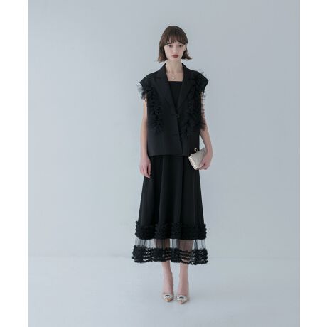 ジャケットはテーラードカラーで程よくかっちりとした印象を持ちながら、肩から袖にかけてあしらわれた立体的なチュールのフリルが、女性らしい華やかさを添えています。