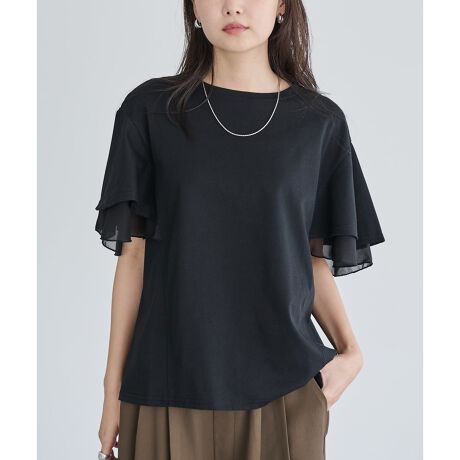 袖のフレア下には同系色のシフォンを重ねたデザイン。軽やかなシフォンを組み合わせることで涼し気な印象に。