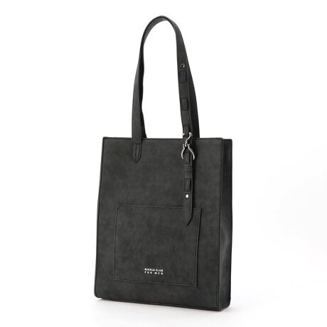 モードな雰囲気を演出する縦型トートバッグ。マグネット口のフロントポケットは素材を大胆に切り替え、見た目にインパクトを持たせました。ハンドル部分はフックバックルを取り付けたベルト仕様にすることで、長さの調節機能と高級感のあるデザイン性を両立。箔押しのブランドロゴがアクセントになっています。