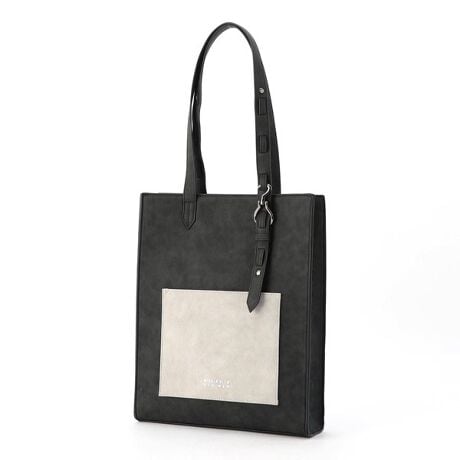 モードな雰囲気を演出する縦型トートバッグ。マグネット口のフロントポケットは素材を大胆に切り替え、見た目にインパクトを持たせました。ハンドル部分はフックバックルを取り付けたベルト仕様にすることで、長さの調節機能と高級感のあるデザイン性を両立。箔押しのブランドロゴがアクセントになっています。
