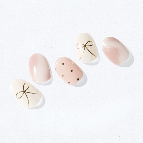 甘いハーモニーを奏でるピンク×ゴールドの上品ネイル。しっとり落ち着いたピンクにゴールドをアクセントに加えたデザイン。リボンのモチーフとドットが愛らしく、指先の表情を優雅に見せます。デイリーから華やかなシーンまで、おまかせ。