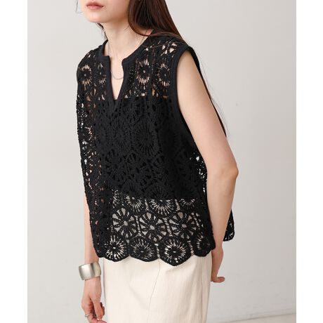 フラワーモチーフのクロシェ編みがさらっとした肌ざわりでストレスフリーな1枚です。繊細なクロシェ編みの為、引っ掛けには充分ご注意ください。
