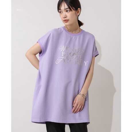 表目に凹凸感のある涼しげなサッカー素材を使用したロゴチュニックです。程良い丈感のチュニックは気になる腰回りをカバーアップ箔の艶っとしたアートロゴプリントが大人カジュアルなアイテムです。