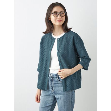 [型番:6204268]サークル幾何学柄のレースが可愛らしい羽織りブラウスです。1枚着としてもカーディガンとしても楽しめる夏に活躍するアイテムです。デニムと合わせてレースの甘さを抑えた大人のカジュアルスタイルがお勧めです。シンプルなサマードレスの上にさっと羽織ればお呼ばれの席にも使える綺麗目コーデが完成します。