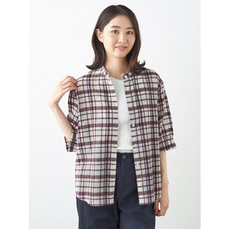 [型番:6204265]チェック柄の6分袖ブラウスです。程よいシアー感のある綿100%の生地を使用。お顔周りがスッキリ見えるバンドカラーと6分丈の短め袖は夏に向けて涼しく着れるアイテムとなっています。甘くなりすぎない大人に似合うカラーを用意しました。