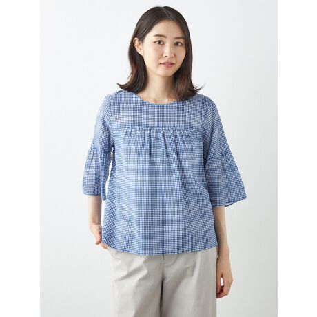 [型番:6204266]ニュアンスあるチェック柄が魅力的なギャザーたっぷりのブラウスです。6分丈の袖にもたっぷりギャザーを取っているのでしっかりとひじをカバーしながら涼しく快適な着心地。身頃にもたくさんのギャザーを取っているので体のラインを気にせずフェミニンなスタイルを楽しめます。デニムと合わせた夏のヘルシーなスタイルもお勧めです。