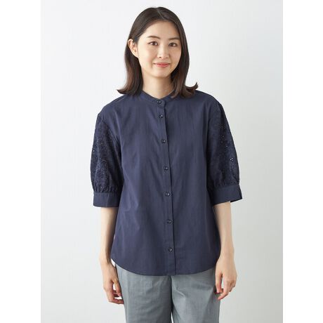 [型番:6204250]袖部分に綿レースを使った夏らしいブラウスです。袖の綿レースは花柄のモチーフ刺繍と透かし柄の入ったナチュラルな雰囲気です。綿100%のローン生地がベースになっているので着心地も爽やか。夏らしいイエローと合わせやすいネイビーの2色展開です。