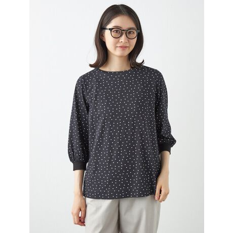 [型番:6204790]フェミニンな小さめドット柄のプリントカットソーです。リラックス感のあるゆとりあるAライン。袖口はフライス生地を使用し、ギャザーを寄せるデザインに。1枚で様になるブラウスライクなカットソーです。
