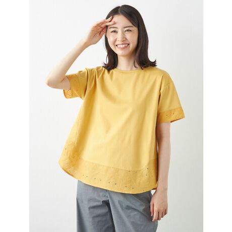 なめらかなスムース素材にエスニックな雰囲気の刺繍生地をドッキングさせたデザインカットソーです。裾はラウンドカットになっていてかわいらしい印象に。体のラインを気にしないゆったりとしたサイズ感が嬉しいストレスフリーなプルオーバーです。