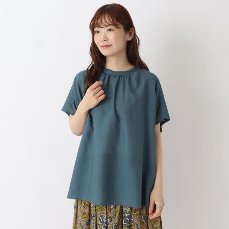 衿ぐりにギャザーがあるので華やかさと、ラウンドヘムがこなれた印象をプラスします。