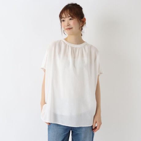 衿ぐりにギャザーがあるので華やかさと、ラウンドヘムがこなれた印象をプラスします。