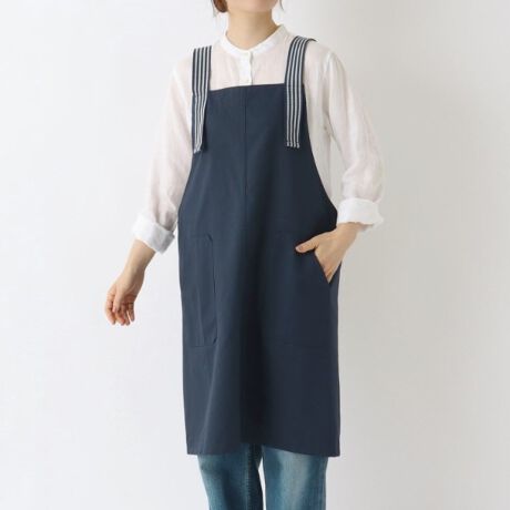 ストライプの肩紐が特徴のカジュアルスタイルなエプロン。