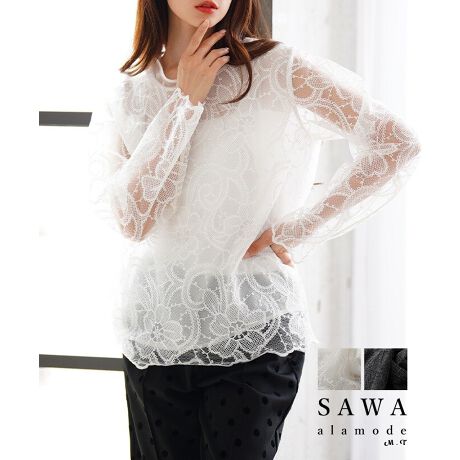 【トップス】 カットソー 花柄 レース シアー レイヤード スカラップ 長袖 ブラック ホワイト