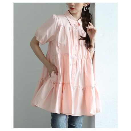 ふんわりとしたティアードのシルエットがスイートな大人スタイリングに仕上がるシャツチュニック。たっぷりの生地を使用し、ティアードのふんわりとしたシルエットがシンプルながらも着映え力のある一枚。シャツ仕立てだからきちんと感を纏い、パフスリーブで二の腕をカバーしながら甘さを加速させ、どこから見てもキュンとするスタイリングに仕上がり、乙女心を鷲掴み。チュニック丈だから、お腹やヒップ、太ももをカバーする安心さも嬉しいポイント。コットン100%の生地で通気性も良く、汗ばむ季節にも快適な着心地に。ボタンで開閉可能だから羽織りとしても活躍します。両サイドに便利なポケット付き。綺麗めからカジュアルまで、スイートな女性らしさを演出してくれるチュニックです。