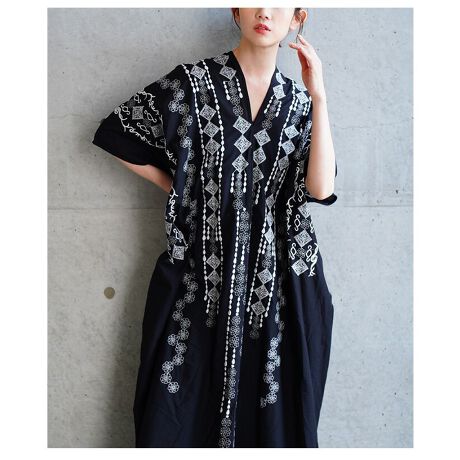 自然の温もりを感じる刺繍デザインインド綿カフタンワンピース。華やかに飾る刺繍が明るい雰囲気つくるデザイン。体型カバーも叶うゆったりシルエットでラフな着心地に。抜け感つくるVネックラインが顔周りをスッキリ見せてくれます。涼しげで自然を感じるインド綿が魅力的な1枚です。