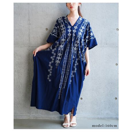 自然の温もりを感じる刺繍デザインインド綿カフタンワンピース。華やかに飾る刺繍が明るい雰囲気つくるデザイン。体型カバーも叶うゆったりシルエットでラフな着心地に。抜け感つくるVネックラインが顔周りをスッキリ見せてくれます。涼しげで自然を感じるインド綿が魅力的な1枚です。