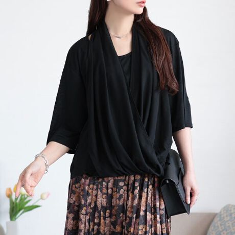 シアー感のある異素材ストールが重ねられたデザインで、一枚で上品さ漂うスタイリングが完成するプルオーバー。シンプルなカットソーにフェイクストールが重ねられることで、立体感あるシルエットに。カジュアルにも綺麗めにもマッチし、オンにもオフにも馴染む大人なアイテム。立体感のあるストールが華奢見え効果を発揮し、ゆったりとした着心地でストレスフリー。ストールはカットソーと一体型で襟足部分のボタンでズレを防止し、首肉をカバーします。スリット入りのスリーブですっきり見えし、ボトムに合わせやすい丈感でコーデしやすいのも嬉しい♪