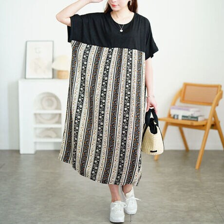 シーズンムード高まる小花柄切り替えワンピースの登場です☆高めの胸元切り替えで脚長&スタイルアップ見えするこだわりシルエット◎暑い季節に大活躍するロング丈のワンピースは、ぽっちゃりさんの気になる〈ぽっこりお腹・二の腕・ヒップ・太もも〉一枚着るだけでまるっと体型カバーしてくれる優秀な一着☆目を惹くエスニック風の小花ストライプ柄の切り替えが装いに個性をプラスし、カジュアルなアイテムながらもレーヨン素材独自のしなやかな落ち感がお洒落を加速させます。