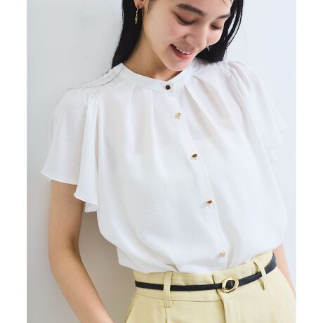 繊細なシャーリングデザインが肩に施された、上品さと女性らしさが引き立つ一枚。