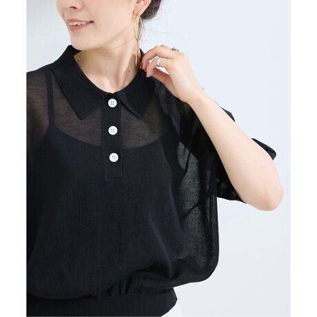 ハリ感あるポリエステル混素材のポロ型シルエットで釦を開けてスキッパー風にも着られる、程よいシアー感ある素材のニットになります。