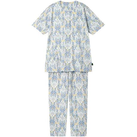 【パジャマ(5分袖ロングパンツ)】1793年に誕生以来、代表される「ハドンホール」柄を始め、多くのコレクションを世に送り出し続けている「ミントン」。その気品あふれる美しい柄を使用したパジャマ。・強撚糸を使うことでシャリ感をもたせ、さらに生地表面の毛羽を取る特殊な加工をほどこした、綿100%の天竺素材を本体に使用・接触冷感性があり、清涼感のある着ごこちで夏におすすめ・大胆な葉とつぼみがアクセントのダマスク調の柄に〈ハドンホール〉柄をちりばめた、モダンで華やかな印象のデザイン※〈ハドンホール〉1948年にデザインされ、発売以来、世界中で愛されているロングセラーの図柄。パッションフラワー、パンジー、カーネーションなどが図案化され、東洋的なエキゾチシズムが感じられるデザイン[資料元:(株)川島織物セルコン]【サイズ詳細】M:身幅52.0cm 着丈67.0cm 身丈69.5cm 肩幅40.0cm 袖丈24.0cm ボトム脇丈95.0cm 裾まわり39.0cm ウエスト58.0cm ヒップ100.5cm 股下(レングス)67.5cmL:身幅56.0cm 着丈67.0cm 身丈69.5cm 肩幅41.5cm 袖丈24.0cm ボトム脇丈95.5cm 裾まわり41.0cm ウエスト63.0cm ヒップ104.5cm 股下(レングス)67.0cmLL:身幅60.0cm 着丈68.0cm 身丈71.0cm 肩幅43.0cm 袖丈24.5cm ボトム脇丈96.0m 裾まわり44.0cm ウエスト68.0cm ヒップ109.5cm 股下(レングス)67.0cm3L:身幅64.0cm 着丈69.0cm 身丈72.0cm 肩幅44.5cm 袖丈24.5cm ボトム脇丈96.5cm 裾まわり47.0cm ウエスト73.0cm ヒップ114.5cm 股下(レングス)67.0cm※出来上がり寸法を表示しております※アイテムによって柄の出方が異なりますのでご了承ください。