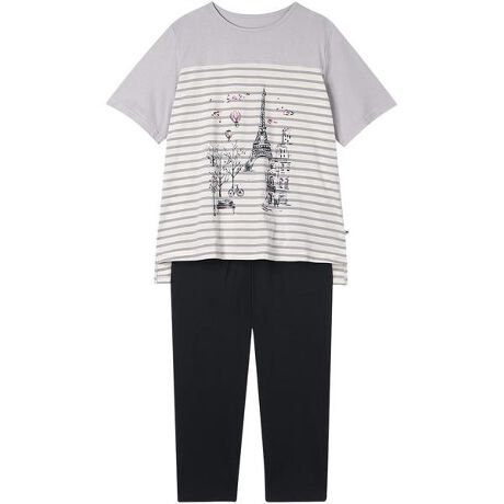 【パジャマ(5分袖ロングパンツ)】「ワコール人間科学研究開発センター」の女性の体型データをもとにしたグランダー独自のサイズ設計は、ゆったり快適な着ごこち。グランダーならではの便利でやさしい工夫をほどこした親切設計のパジャマです。・着ごこちゆったり親切設計のポイント1.背・脇に縫い付けネームがなく、やさしい肌あたり2.やわらかなゴムでウエストがラク3.ズボンの前後がわかりやすい目印付き4.くいこみにくく動きやすいマチ付き5.裾口、ウエストにゴム替え口・本体に、綿100%の天竺素材を使用・トップスはシンプルなボーダーに手描きタッチのパリの街並みをプリント・身頃の丈は前後で差をつけ、前はすっきり、後ろはヒップが気になりにくいバランスで設計・リラックスシーンはもちろん、配達など不意の訪問にも対応できるアイテムとしてもおすすめ【サイズ詳細】SP:身幅49.5cm 着丈67.0cm 身丈65.5cm 肩幅37.0cm 袖丈24.5cm ボトム脇丈90.0cm 裾まわり32.5cm ウエスト55.0cm ヒップ101.5cm 股下(レングス)62.0cmMP:身幅53.5cm 着丈67.0cm 身丈65.5cm 肩幅39.0cm 袖丈24.5cm ボトム脇丈90.5cm 裾まわり34.0cm ウエスト60.0cm ヒップ106.5cm 股下(レングス)62.0cmLP:身幅57.5cm 着丈67.0cm 身丈66.0cm 肩幅41.0cm 袖丈24.5cm ボトム脇丈91.5cm 裾まわり35.5cm ウエスト65.0cm ヒップ111.5cm 股下(レングス)62.0cm※出来上がり寸法を表示しております