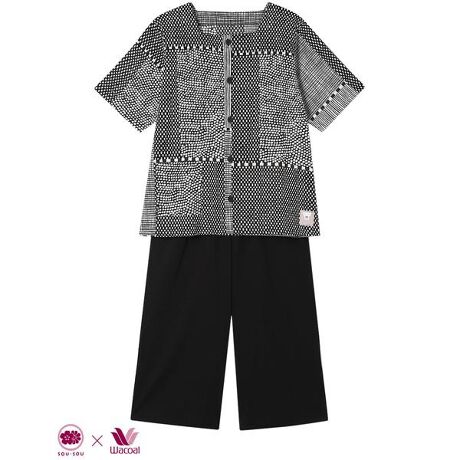 【パジャマ(5分袖7分パンツ)】『新しい日本文化の創造』をコンセプトに、現代のライフスタイルに寄り添うものづくりを展開する京都のブランド「SOU・SOU」デザイン、生地、縫製のすべてをMADE IN JAPANにこだわったインテリアウエアです。※「インテリアウエア」は若林株式会社の登録商標です。・古くからちぢみ織物の産地として知られる滋賀県高島地方の「高島ちぢみ(R)」を使用・撚りの強いヨコ糸を使い、全体に凹凸をつけているので、肌ばなれがよく夏におすすめ・吸汗速乾性があり、さらっと快適な着ごこち・くつろぎ時間にぴったりのゆったりとしたシルエット・四角くあいたネックラインがデザインポイントの前明きパジャマ※「高島ちぢみ(R)」は高島織物工業協同組合の登録商標です※アイテムによって柄の出方が異なりますのでご了承ください【サイズ詳細】M:身幅50.0cm 着丈59.5cm 身丈62.0cm 肩幅40.0cm 袖丈24.0cm ボトム脇丈77.0cm 裾まわり56.5cm ウエスト58.0cm 股下(レングス)48.0cm ヒップ110.0cmL:身幅54.0cm 着丈59.5cm 身丈62.0cm 肩幅41.5cm 袖丈24.0cm ボトム脇丈77.5cm 裾まわり58.5cm ウエスト63.0cm 股下(レングス)48.0cm ヒップ114.0cm※出来上がり寸法を表示しております