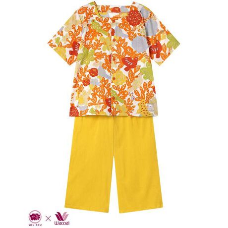 【パジャマ(5分袖7分パンツ)】『新しい日本文化の創造』をコンセプトに、現代のライフスタイルに寄り添うものづくりを展開する京都のブランド「SOU・SOU」デザイン、生地、縫製のすべてをMADE IN JAPANにこだわったインテリアウエアです。※「インテリアウエア」は若林株式会社の登録商標です。・古くからちぢみ織物の産地として知られる滋賀県高島地方の「高島ちぢみ(R)」を使用・撚りの強いヨコ糸を使い、全体に凹凸をつけているので、肌ばなれがよく夏におすすめ・吸汗速乾性があり、さらっと快適な着ごこち・くつろぎ時間にぴったりのゆったりとしたシルエット・四角くあいたネックラインがデザインポイントの前明きパジャマ※「高島ちぢみ(R)」は高島織物工業協同組合の登録商標です※アイテムによって柄の出方が異なりますのでご了承ください【サイズ詳細】M:身幅50.0cm 着丈59.5cm 身丈62.0cm 肩幅40.0cm 袖丈24.0cm ボトム脇丈77.0cm 裾まわり56.5cm ウエスト58.0cm 股下(レングス)48.0cm ヒップ110.0cmL:身幅54.0cm 着丈59.5cm 身丈62.0cm 肩幅41.5cm 袖丈24.0cm ボトム脇丈77.5cm 裾まわり58.5cm ウエスト63.0cm 股下(レングス)48.0cm ヒップ114.0cm※出来上がり寸法を表示しております