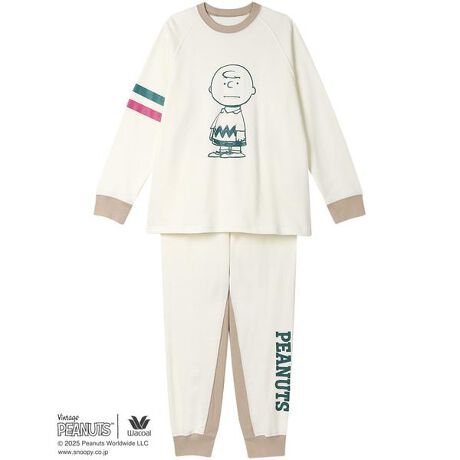【PEANUTS×ワコール】1950年に新聞コミックとしてスタートした「PEANUTS」とワコールがコラボレーション。世界中で愛されるスヌーピーや個性豊かな仲間たちのデザインでおうち時間を楽しんで。【パジャマ(ロング袖ロングパンツ)】・本体に、軽やかな綿100%のガーゼ裏毛素材を使用・さらっとした肌ざわり・切り替え部分には、綿100%の針抜きフライス素材を使用し、アクセントに・前身頃のチャーリー・ブラウン、ボトム左裾のPEANUTSロゴ、右袖の2本ラインのハンドプリントがデザインポイント・アウターライクなデザインで、リラックスシーンにもおすすめ【サイズ詳細】M:身幅51.0cm 着丈62.0cm 身丈65.5cm 裄丈75.0cm ボトム脇丈92.0cm 裾まわり22.0cm ウエスト58.0cm 股下(レングス)64.5cm ヒップ101.5cmL:身幅55.0cm 着丈62.0cm 身丈65.5cm 裄丈75.5cm ボトム脇丈92.5cm 裾まわり23.0cm ウエスト63.0cm 股下(レングス)64.0cm ヒップ105.5cmLL:身幅59.0cm 着丈63.0cm 身丈67.0cm 裄丈77.0cm ボトム脇丈93.0cm 裾まわり25.0cm ウエスト68.0cm 股下(レングス)64.5cm ヒップ110.5cm※出来上がり寸法を表示しております表面フラッシュにご注意ください台所等で火を扱う場合には、表面の毛羽に引火することがありますので、十分にご注意ください。また、裏返して着用しないでください。「表面フラッシュとは」生地の表面毛羽に着火した火が、毛羽から毛羽へ、非常に早いスピードで、瞬時に火が走る現象です。パイル・タオル地や表面を起毛した素材で起こりやすく、綿やレーヨンなど植物せんい使用の素材にも、注意が必要です。これにより、火傷や火事になることも考えられます。炊事や暖房機具等の火には、十分ご注意ください。