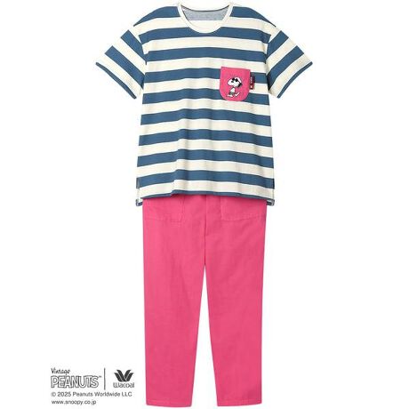 【PEANUTS×ワコール】1950年に新聞コミックとしてスタートした「PEANUTS」とワコールがコラボレーション。世界中で愛されるスヌーピーや個性豊かな仲間たちのデザインでおうち時間を楽しんで。【パジャマ(4分袖ロングパンツ)】・トップス本体に、暑い季節にここちよいシャリ感のある強撚糸を用いた綿100%の天竺素材を使用・ボトム本体と胸ポケットに、綿100%のニ重ガーゼを使用・シンプルなボーダー柄のトップスと無地のボトムのセットアップ・胸ポケットにはスヌーピーの刺繍をあしらいアクセントに・アウターライクなデザインで、リラックスシーンにもおすすめ【サイズ詳細】M:身幅53.0cm 着丈63.5cm 身丈65.0cm 肩幅47.0cm 袖丈16.5cm ボトム脇丈92.5cm 裾まわり38.0cm ウエスト58.0cm 股下(レングス)62.5cm ヒップ107.0cmL:身幅57.0cm 着丈63.5cm 身丈65.0cm 肩幅48.5cm 袖丈16.5cm ボトム脇丈93.0cm 裾まわり40.0cm ウエスト63.0cm 股下(レングス)62.0cm ヒップ111.0cmLL:身幅61.0cm 着丈64.5cm 身丈66.0cm 肩幅50.0cm 袖丈17.0cm ボトム脇丈93.5cm 裾まわり43.0cm ウエスト68.0cm 股下(レングス)62.0cm ヒップ116.0cm※出来上がり寸法を表示しております