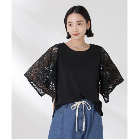 バテンレース風の柄で切り替えた袖がポイントのカットトップス。スクエア型の立体的なフレア袖が動きや仕草を上品で華やかな印象にしてくれるひと品。Tシャツのようにラフに着回せて、カジュアルにもキレイめにも重宝します。