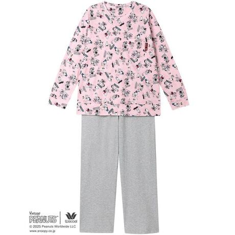 【PEANUTS×ワコール】1950年に新聞コミックとしてスタートした「PEANUTS」とワコールがコラボレーション。世界中で愛されるスヌーピーや個性豊かな仲間たちのデザインでおうち時間を楽しんで。【パジャマ(ロング袖ロングパンツ)】・トップス本体に、綿100%のスムース素材を使用・ボトム本体に、暑い季節にここちよいシャリ感のある強撚糸を用いた綿100%の天竺素材を使用・個性豊かな仲間たちとスヌーピーをプリント【サイズ詳細】M:身幅53.0cm 着丈62.5cm 身丈65.5cm 肩幅47.0cm 袖丈51.5cm ボトム脇丈95.0cm 裾まわり50.0cm ウエスト58.0cm 股下(レングス)67.5cm ヒップ99.0cmL:身幅57.0cm 着丈62.5cm 身丈65.5cm 肩幅48.5cm 袖丈51.5cm ボトム脇丈95.5cm 裾まわり52.0cm ウエスト63.0cm 股下(レングス)67.0cm ヒップ103.0cmLL:身幅61.0cm 着丈63.5cm 身丈66.5cm 肩幅50.0cm 袖丈52.0cm ボトム脇丈96.0cm 裾まわり55.0cm ウエスト68.0cm 股下(レングス)67.0cm ヒップ108.0cm※出来上がり寸法を表示しております※アイテムによって柄の出方が異なりますのでご了承ください。