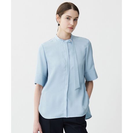 ■デザインメタル釦と長めタイがポイントのデザインブラウスです。二の腕が隠れる袖丈も嬉しいポイント。着るだけでいつものコーディネートをアップデートしてくれます。