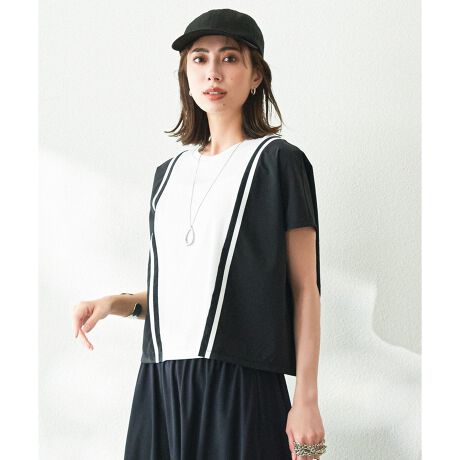 ■デザインシャープな切り替えが目を引くデザインカットソーです。身頃に量感を持たせたワイドシルエットで、身体から生地が離れる涼しい着心地が特徴です。直線の切り替えとバイカラー配色、アクセントになるニットテープのラインがシャープな印象で、カジュアルすぎずON/OFF使いやすいアイテムです。