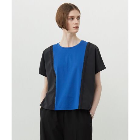■デザインシャープな切り替えが目を引くデザインカットソーです。身頃に量感を持たせたワイドシルエットで、身体から生地が離れる涼しい着心地が特徴です。直線の切り替えとバイカラー配色、アクセントになるニットテープのラインがシャープな印象で、カジュアルすぎずON/OFF使いやすいアイテムです。